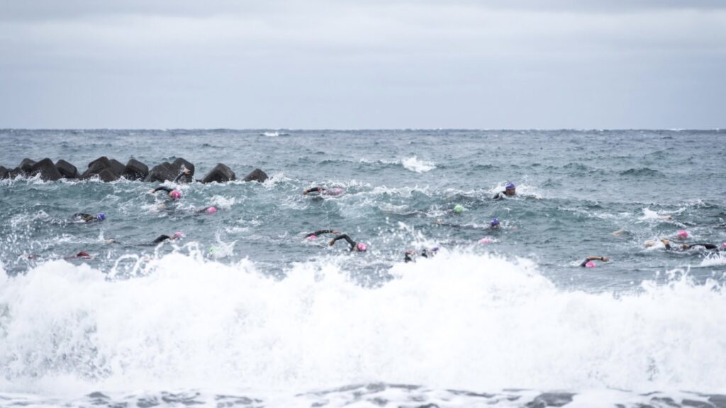 スイムはテトラポットの手前を3周回泳ぐコース。河津の海は例年波は高いらしく、短縮や中止になる年も多い中、今年はフルで開催。初心者は怖いのでは?と思うくらいの波はあったので、スキップしている方も多数。私の感覚では今年9月のIM北海道と比較して浅瀬はマシで、沖はハードという感覚。比較的浅瀬を泳げるので、波に向かう距離は短いものの、沖でのうねりは大きめだった。
