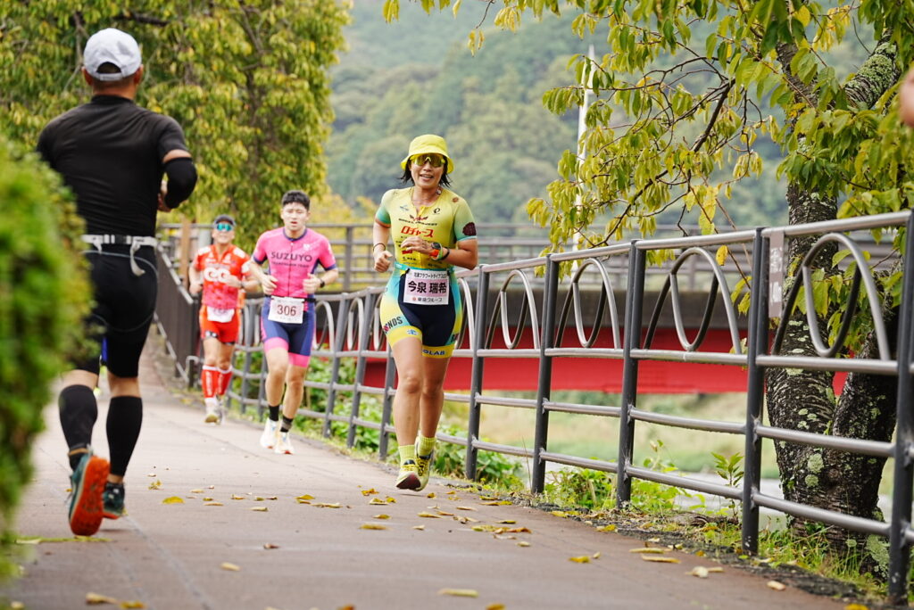 ランは川沿いのサイクリングロード片道2.5kmを2周回するコース。河津桜が咲いている時期も走ったことがあるがとても綺麗なのでオススメ。往路は地味に登り、復路は地味に下り。細めの道路を往復するので選手間の距離が近く、すれ違うたびに声をかけられるので、とても元気をもらえる良いコースだった◎
