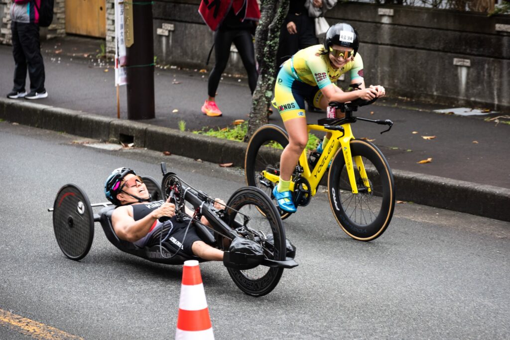 スイムアップした際に同じくゲストの木村選手とタイミングが重なり、トランジションも隣だったので色々お話ししながら準備していた。木村選手のほうがトランジが速かったのに、私を待っていてくれて一緒にバイクスタートすることに!